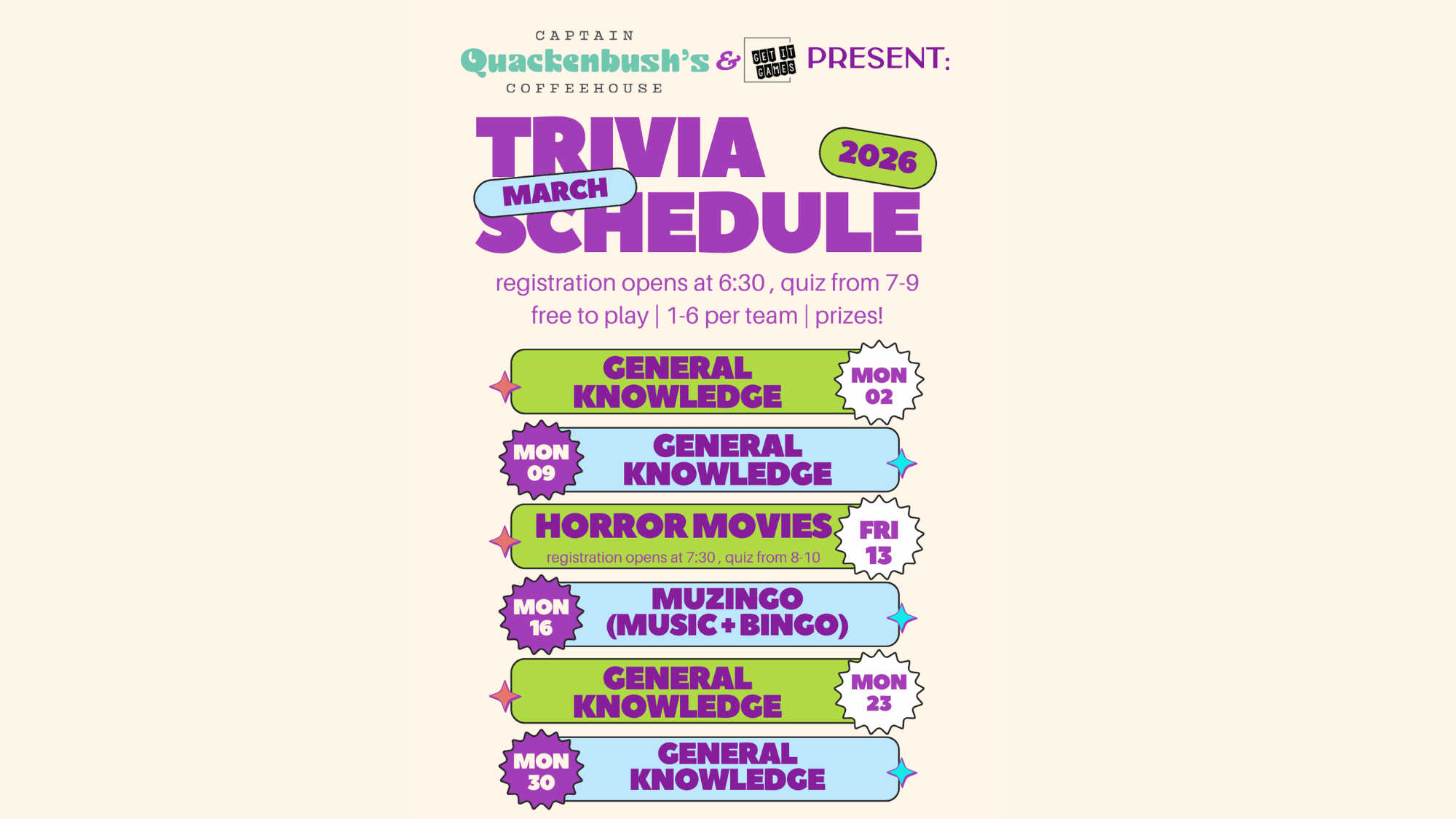 Come join us at Captain Quackenbush’s Coffeehouse for a fun-filled evening of trivia! Test your knowledge on all things while enjoying delicious coffee, snacks and cocktails! Gather your friends and form a team to compete against others for the title of trivia champions. See you there!