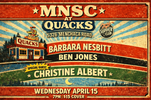 Ben Jones and Barbara Nesbitt, hosts of the popular MNSC (Monday Night Supper Club), will be bringing their show to Sound Space at Captain Quack’s for a special evening of music and storytelling. The event will feature the renowned guest artist Christine Albert.