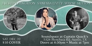 ![]() Join us for an intimate night of music in the round with three unique Austin songwriters. Join us for an intimate night of music in the round with three unique Austin songwriters. The night will feature Tucker Livingston, Vanessa Lively, and Wayne Sutton. Tucker Livingston is a Texas-born singer-songwriter and guitarist whose folk-Americana songs […]