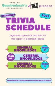 ![]() Come join us for our weekly trivia night! GENERAL KNOWLEDGE TRIVIA WITH GET IT GAMES! Come join us at Captain Quackenbush's Coffeehouse for a fun-filled evening of trivia! Test your knowledge on all things while enjoying delicious coffee, snacks and cocktails! Gather your friends and form a team to compete against others for the title […]